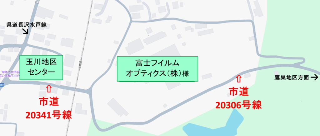 ご質問の一般県道長沢水戸線から富士フイルムオプティクス株式会社へ進入する市道20341号線については、狭隘で勾配もきつく、道路に近接して建物があり、JRの踏切もございますので、拡幅にはさまざまな課題があると考えております。