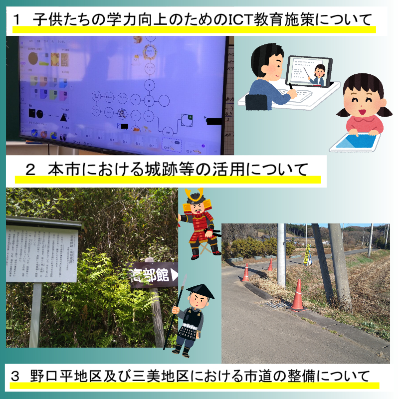 日々の挨拶回りで地域の方々から頂戴した要望の中から、2つの地区の市道をピックアップしました。特に、野口平地区の「旗立て場十文字」については、長年にわたる懸案事項として、今後も現地の状況を注視します。