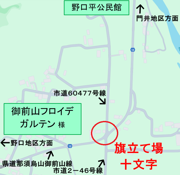 ご質問の「旗立て場十文字」は、野口平地内の御前山フロイデガルデン東側、県道那須烏山御前山線の2つの連続するカーブの途中にあり、南北からの市道と斜めに合流する交差点です。