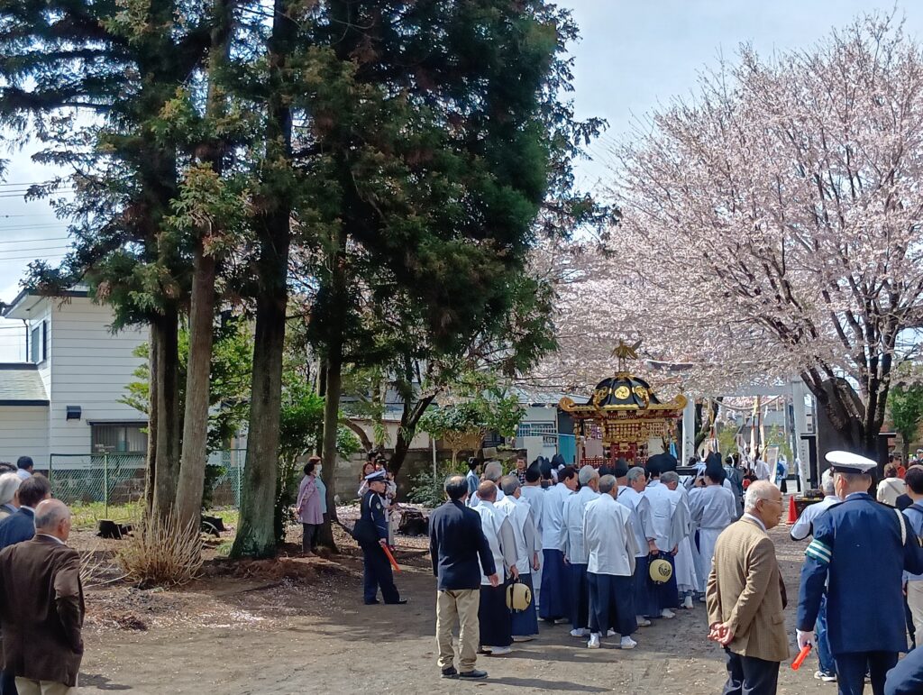明治14年に奉納された神輿が境内の桜の木の下を練り歩く様子を拝見でき、